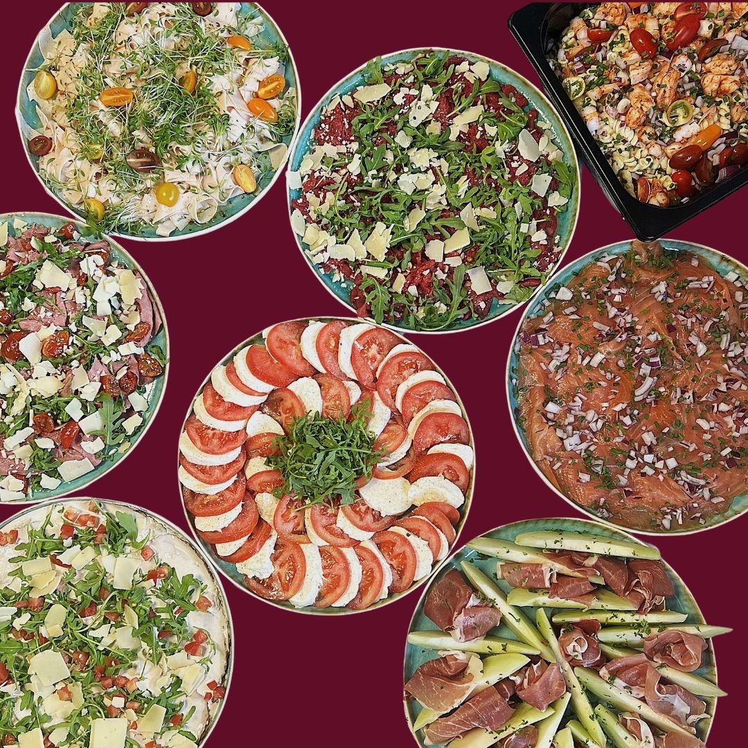 Een gevarieerd buffet met heerlijke schoteltjes zodat je van alles wat kan proeven: rundscarpaccio, vitello tonnato, tomaat-mozzarella, gerookte zalm, Italiaanse ham met meloen, pastrami met rucola, kipcarpaccio, fijne Italiaanse vleeswaren en pastasalade met scampi.